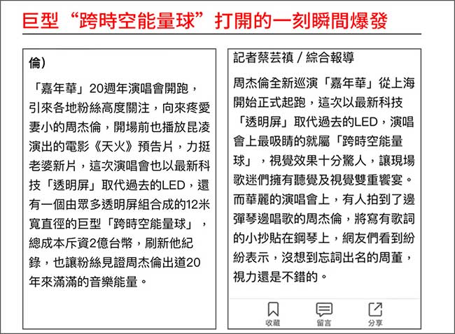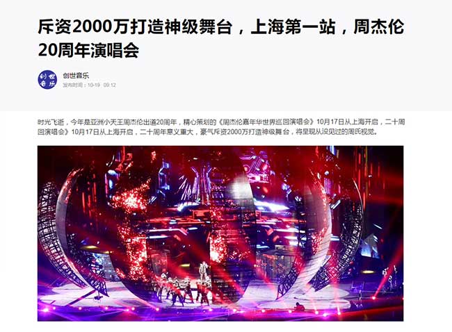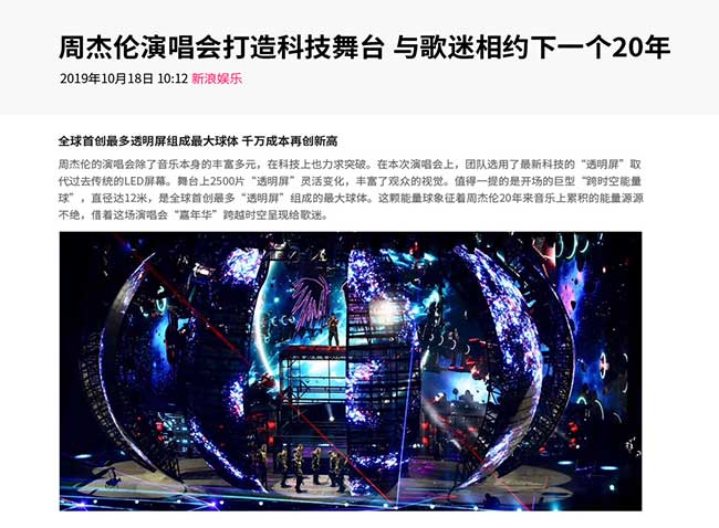 虽然「嘉年华」演唱会上海站已落下帷幕,但对这次由酷游九州(中国)科技有限公司官网(股票代码:837293)制造安装的12米高,10米宽的巨型「跨时空能量球」P10球形屏和最新研发产品「龙系列—龙腾禧」透明屏打造的高科技豪华舞台,显示屏的镂空设计和透光透风设计为舞台表演营造出更加绚烂多彩的气氛,恰到好处的为音乐演唱表现形成了一个很好的延展。现在「跨时空能量球」持续引起各界人士热议和追捧。请看来自各大媒体的官宣报道。