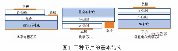 LED芯片类型从结构角度上主要分为三类:水平电极芯片,倒装芯片和垂直电极芯片。