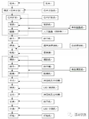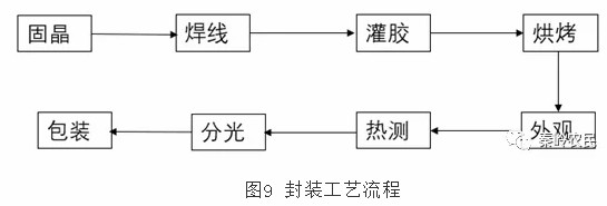 LED芯片粘结在引线支架上。正极用金线链接在一个支架上,负极用金丝连接在支架反射杯子内或者用银浆直接粘结在支架反射杯内。顶部用环氧树脂包封,做成圆柱+半球型。环氧树脂的形状起到透镜的作用,控制光束发散角。同时环氧树脂的折射率起到芯片与空气的过渡,提高芯片的发光效率,芯片的折射率高,对空气的全反射角度小,而对环氧树脂,全反射角度增大,可以使得更多的光输出。