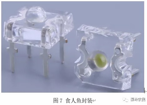 食人鱼封装是正方形的,采用透明树脂的封装,因为它的形状很像亚马逊河中的食人鱼Piranha,故称为食人鱼封装。它有四个引脚,负极处有个缺脚。食人鱼是散光型的LED,发光角度大于120度,发光强度很高,而且能承受更大的功率。由于食人鱼LED所用的支架是铜制的,面积较大,因此传热和散热快。LED点亮后,PN结产生的热量很快就可以由支架的四个支脚到出到PCB的铜带上。