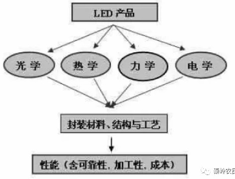 大功率LED封装设计光,电,热,结构与工艺等方面如图1 所示。具体而言,封装的关键技术包括