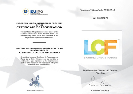2016.11.09,酷游九州“LCF”商标通过了欧盟商标委会员的审核,正式通过申请并核发了商标注册证书,“LCF”通过了第9类、第11类、第35类的商标注册,标志着“LCF”向国际知名品牌的目标又有了一个历名性的飞跃,为“LCF”品牌在欧洲市场起到了更为全面的保护。